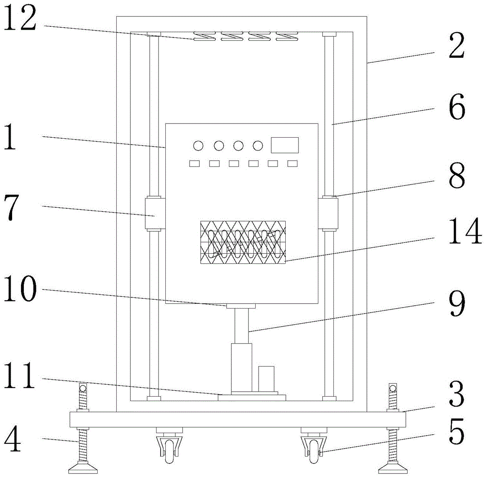 3.根據(jù)權(quán)利要求1所述的一種具有自動(dòng)升降功能的高頻加熱設(shè)備,其特征在于:所述框架(2)的后端焊接有兩個(gè)方向把手(15),所述方向把手(15)上套接有把手套(16)。