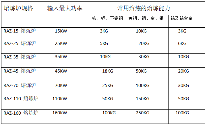下表中所列為每種熔煉爐的最大加熱能力,冷爐時,每爐熔煉時間為50--60分鐘,熱爐時,每爐熔煉時間為20--30分鐘。